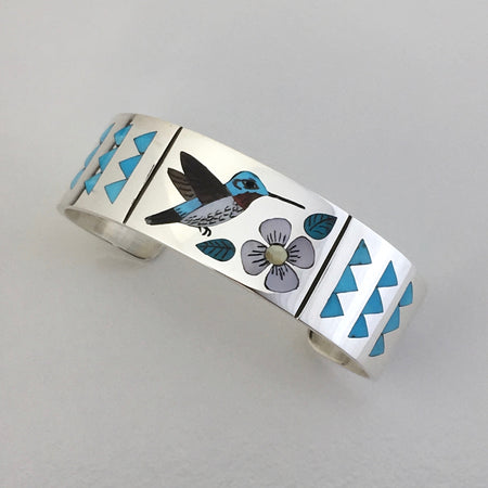 Hummingbird Inlay Zuni Bracelet, by Dennis and Nancy Edaakie