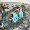 Lovely inlays of turquoise, coral, jet, lapis, white and pink shell, and malachite, and fine etching bring to life a sweet butterfly.