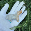 Enrike carves an abundance of different animals, birds and humans. This Happy Horse showcases this carver's ability to bring to life new interpretations of Zuni life. Note the turquoise trotters and brilliant blue eyes!
