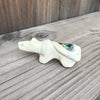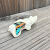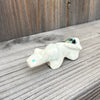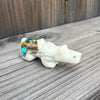 Jayne has created this silky smooth Mountain Lion from white serpentine. Complete with turquoise eyes and geometric stone and shell inlays.