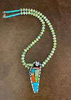 Turquoise, serpentine, conus shell, spiny oyster shell, white clam shell, gaspeite, lepidolite, abalone and other stones inlayed on black jet; graduated disc turquoise are strung on flexible, sturdy wire. This one is ready to bring Joy to the World!